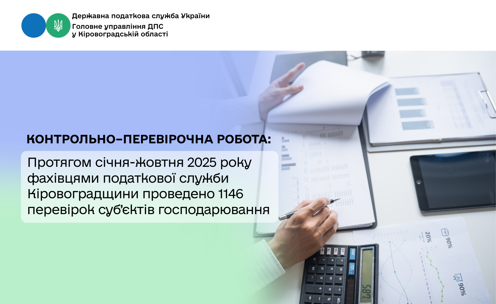 Протягом січня-жовтня 2025 року фахівцями податкової служби Кіровоградщини проведено 1146 перевірок суб’єктів господарювання