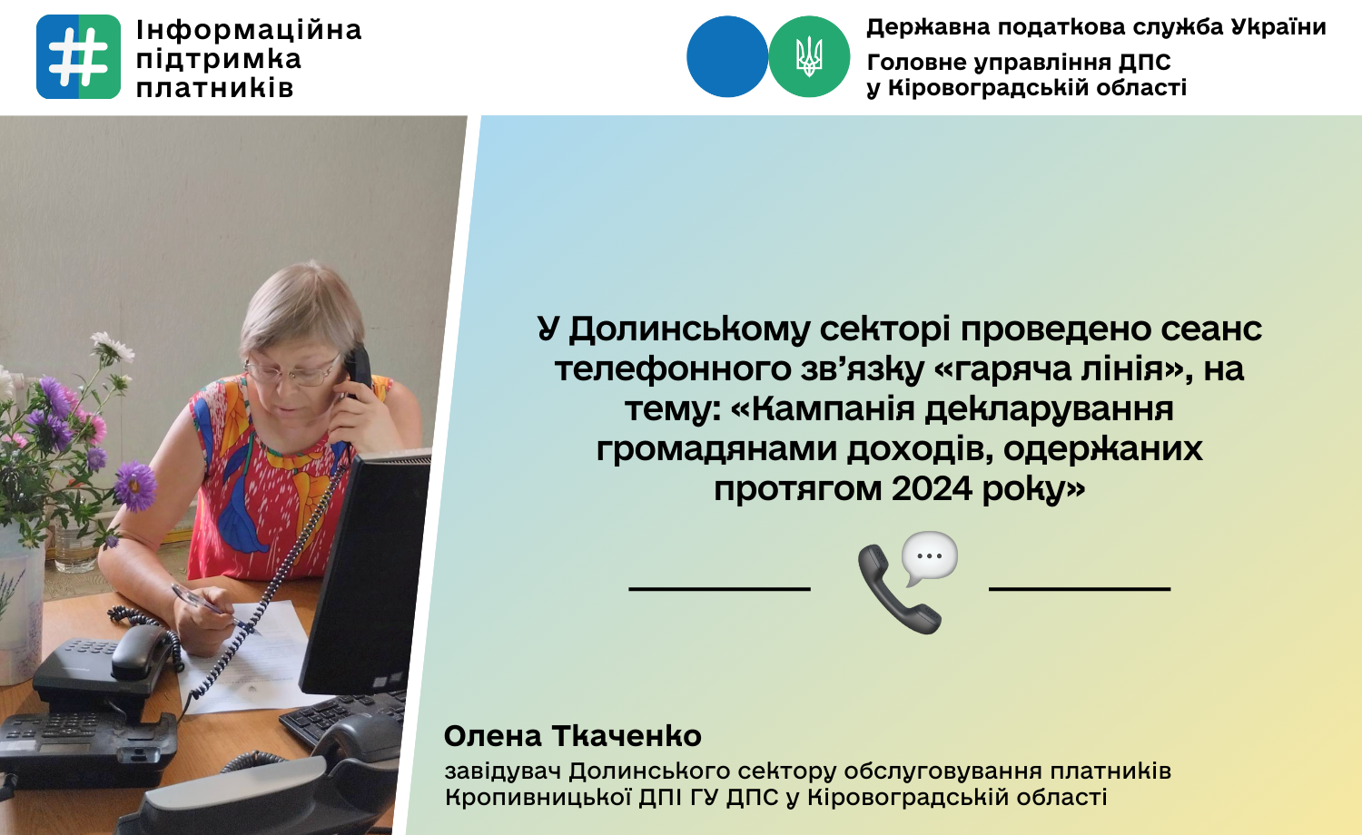 З метою забезпечення об’єктивного інформування платників податків та роз’яснення окремих положень законодавства завідувачкою Долинського сектору Кропивницької ДПІ Головного управління ДПС у Кіровоградській області Оленою ТКАЧЕНКО проведено сеанс телефонного зв’язку «гаряча лінія», на тему: «Кампанія декларування громадянами доходів, одержаних протягом 2024 року».