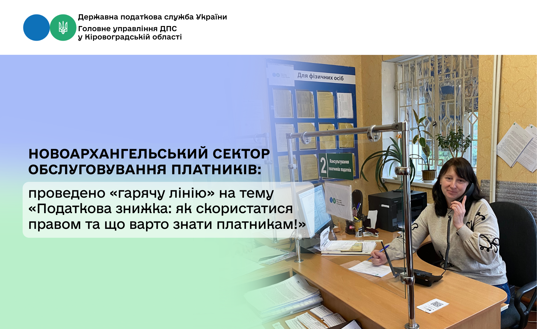 У Новоархангельському секторі обслуговування платників Голованівської державної податкової інспекції Головного управління ДПС у Кіровоградській області 7 листопада 2025 року відбувся сеанс телефонного зв’язку «гаряча лінія» на тему «Податкова знижка: як скористатися правом та що варто знати платникам!».