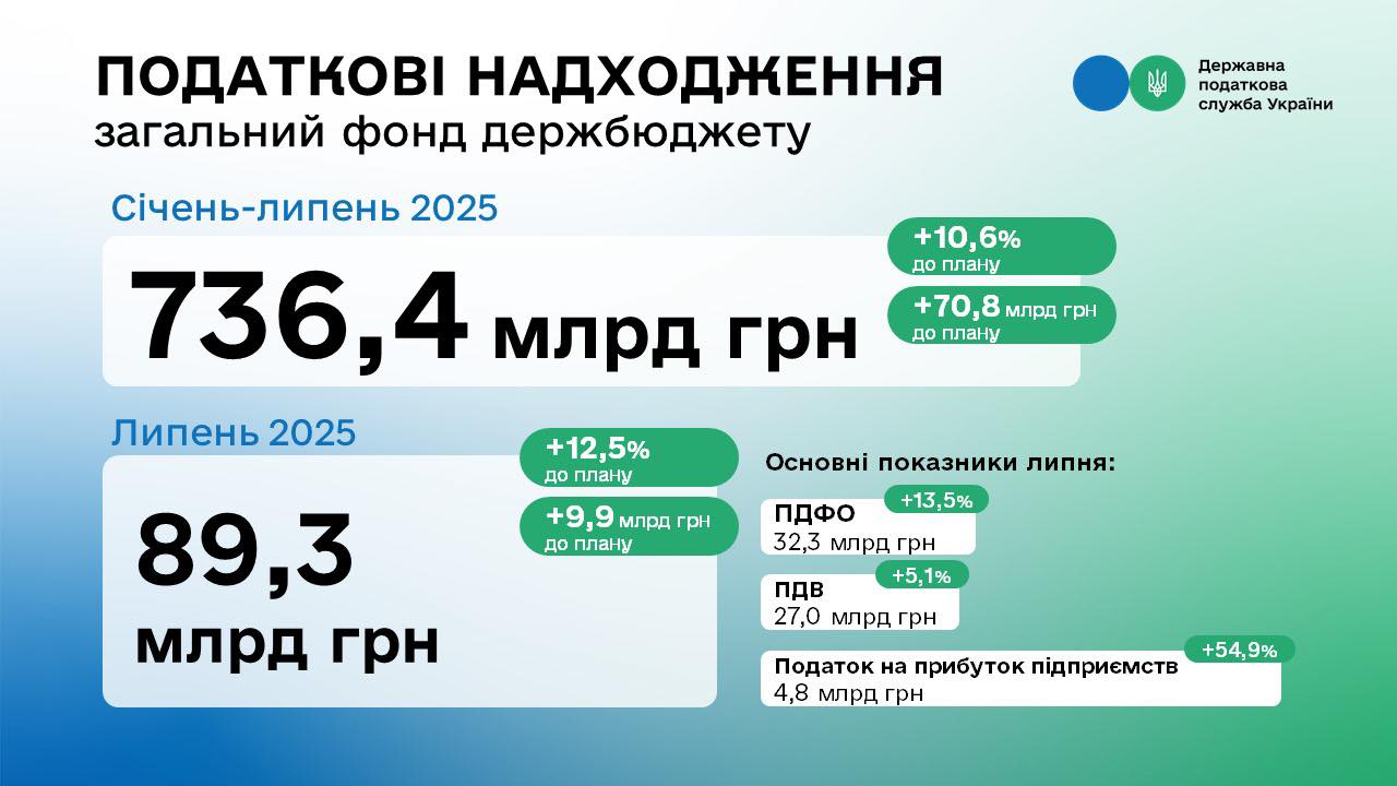 «Загалом до загального фонду держбюджету по платежах, які контролює ДПС, надійшло 89,3 млрд грн (+37,1 % до липня 2024 року). За 7 місяців перевиконали план на 70,8 млрд (+10,6 %)», – додала вона.