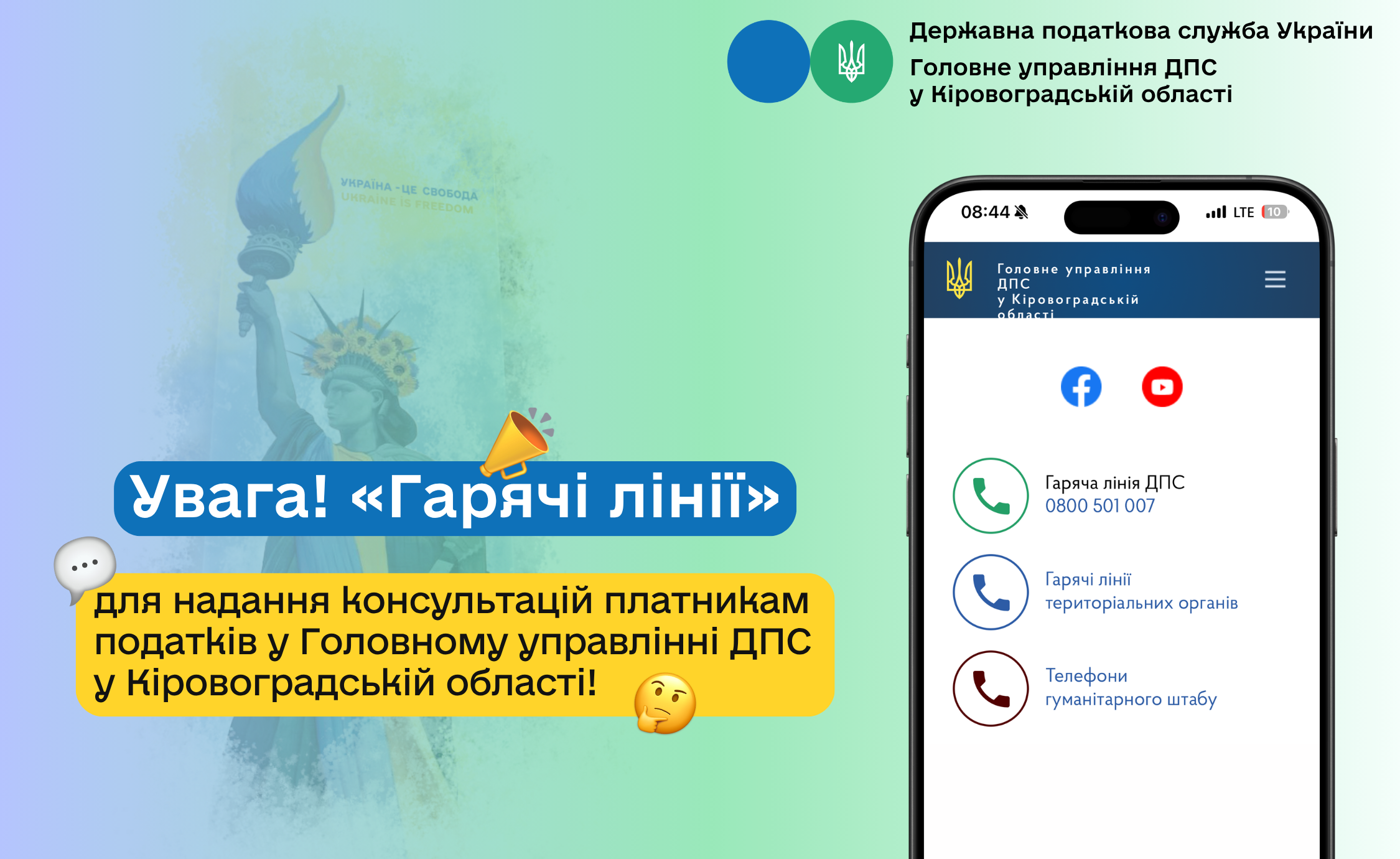 Увага! "Гарячі лінії" для надання консультацій платникам податків у Головному управлінні ДПС у Кіровоградській області!