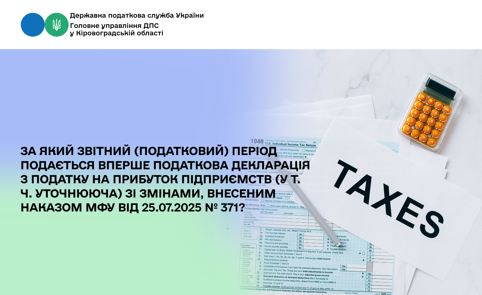 Головне управління ДПС у Кіровоградській області інформує, що 16.09.2025 набрав чинності наказ Міністерства фінансів України від 25.07.2025 № 371 «Про затвердження Змін до форми Податкової декларації з податку на прибуток підприємств».