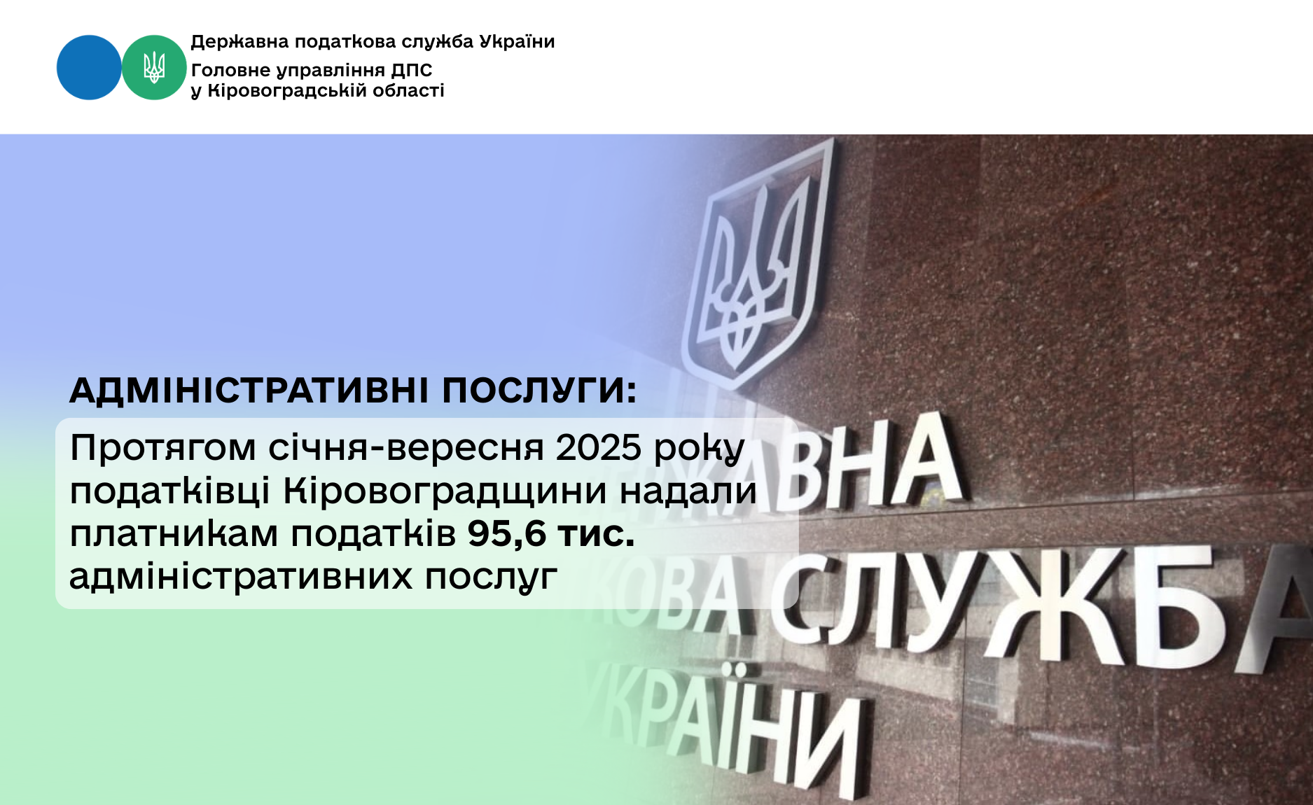 Головним управлінням ДПС у Кіровоградській області через центри обслуговування платників, місця прийому суб’єктів звернень та засобами комунікаційного зв’язку забезпечується надання 60 адміністративних послуг.