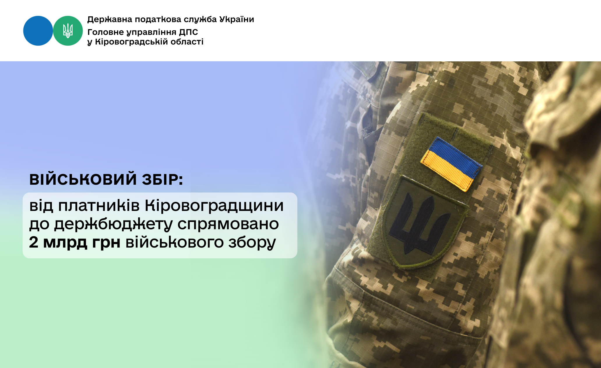 За січень-жовтень 2025 року платниками, які перебувають на обліку в Головному управлінні ДПС у Кіровоградській області до держбюджету сплачено 2,0 млрд гривень військового збору. Порівняно з аналогічним періодом минулого року надходження зросли на 1,3 млрд грн або у 3,4 рази.