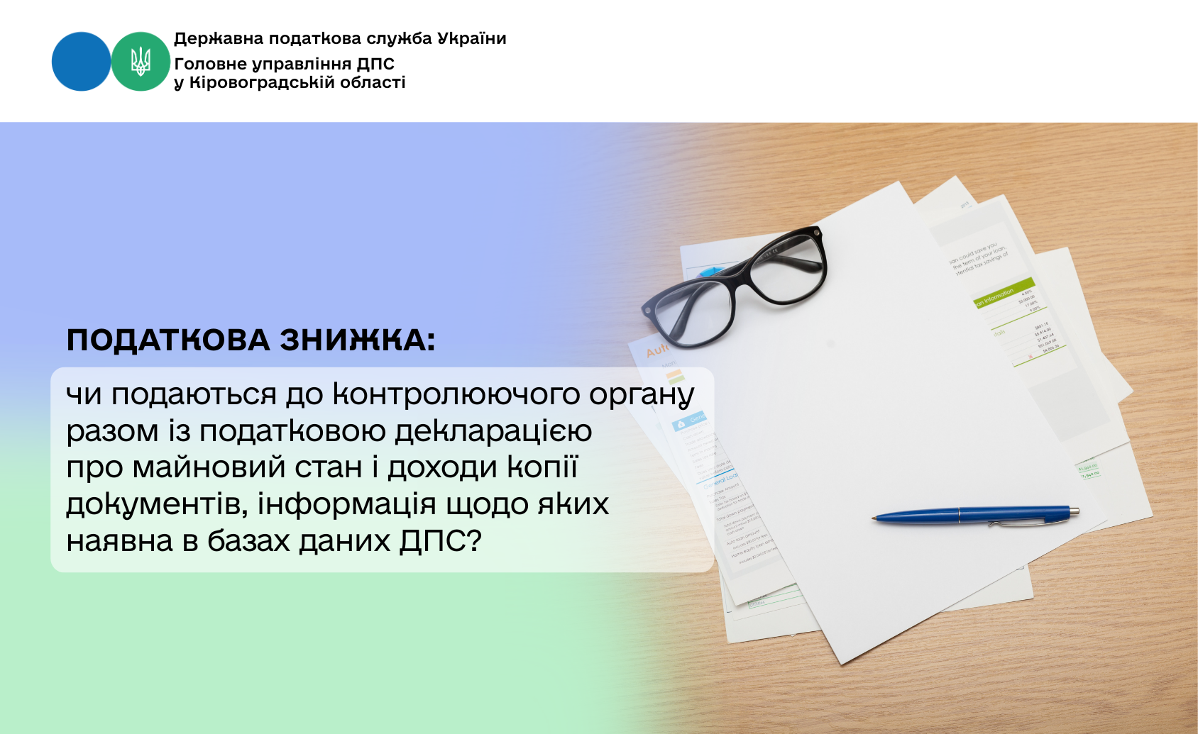 Податкова знижка: чи подаються до контролюючого органу разом із податковою декларацією про майновий стан і доходи копії документів, інформація щодо яких наявна в базах даних ДПС?
