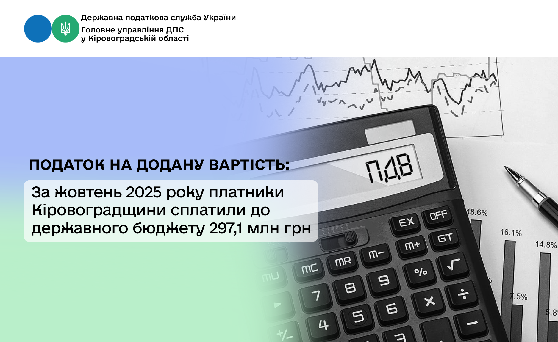 За жовтень 2025 року платники Кіровоградщини сплатили до державного бюджету 297,1 млн гривень