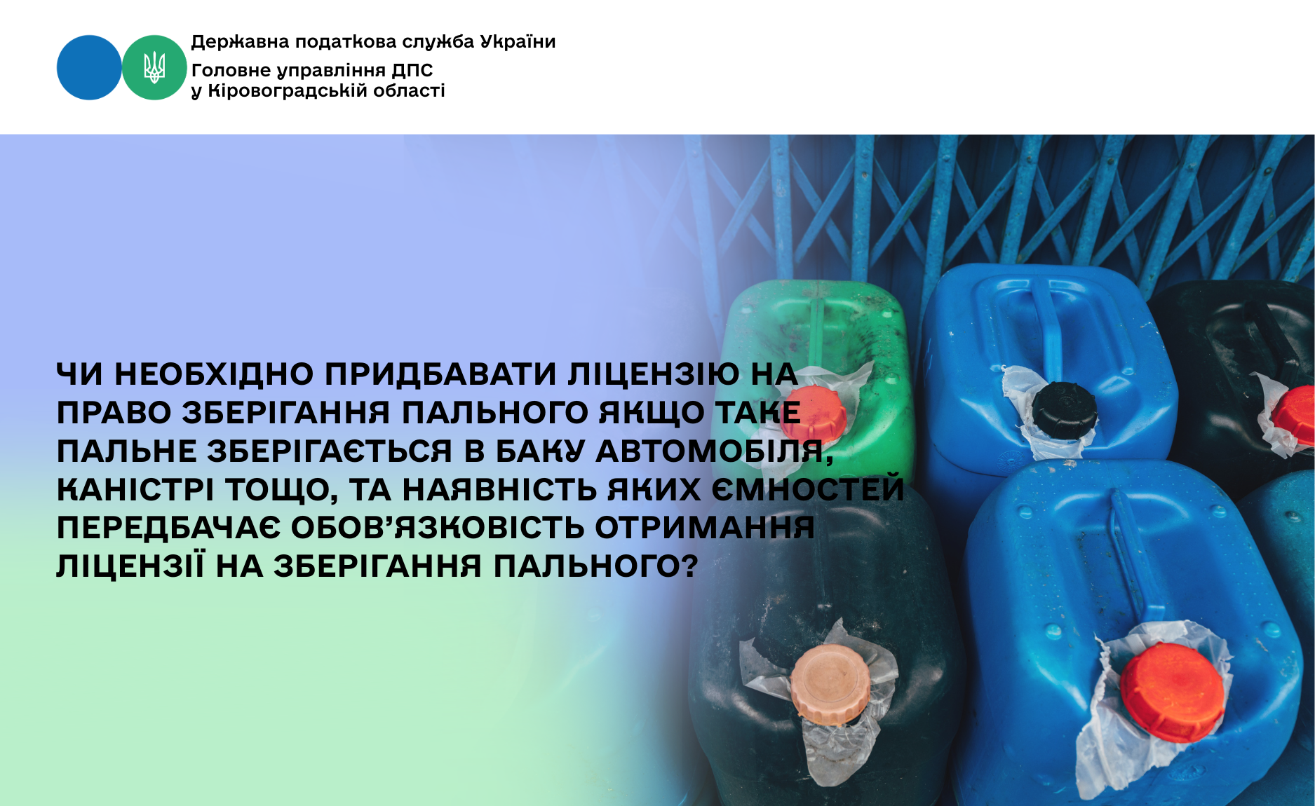 Головне управління ДПС у Кіровоградській області інформує, що відповідно до ст. 28 Закону України від 18 червня 2024 року № 3817-IX «Про державне регулювання виробництва і обігу спирту етилового, спиртових дистилятів, біоетанолу, алкогольних напоїв, тютюнових виробів, тютюнової сировини, рідин, що використовуються в електронних сигаретах, та пального» (далі – Закон № 3817) зберігання пального здійснюється суб’єктами господарювання за наявності ліцензії на право зберігання пального або на право зберігання пального виключно для потреб власного споживання та/або промислової переробки.