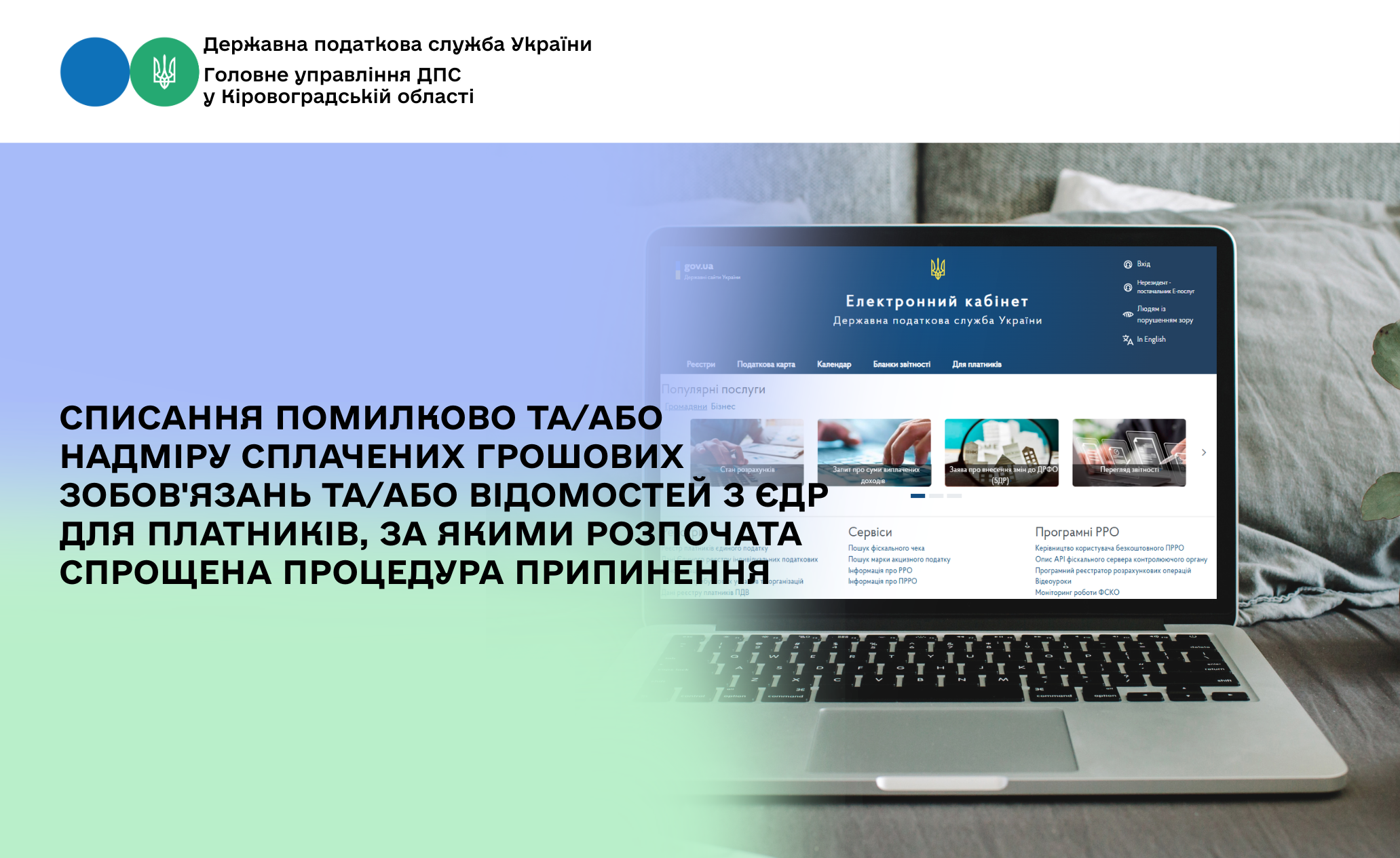- Списання помилково та/або надміру сплачених грошових зобов'язань та/або відомостей з ЄДР для платників, за якими розпочата спрощена процедура припинення