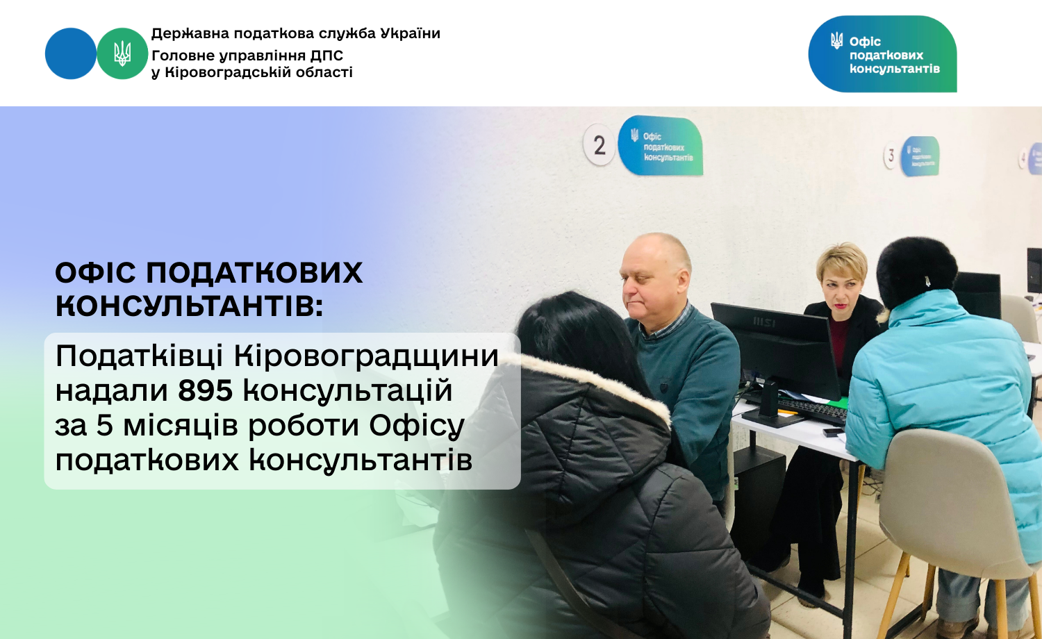 Офіс податкових консультантів при ГУ ДПС у Кіровоградській області за 5 місяців від старту роботи надав 895 консультацій. У січні 2026 року за консультаціями вже звернулись 155 платників.