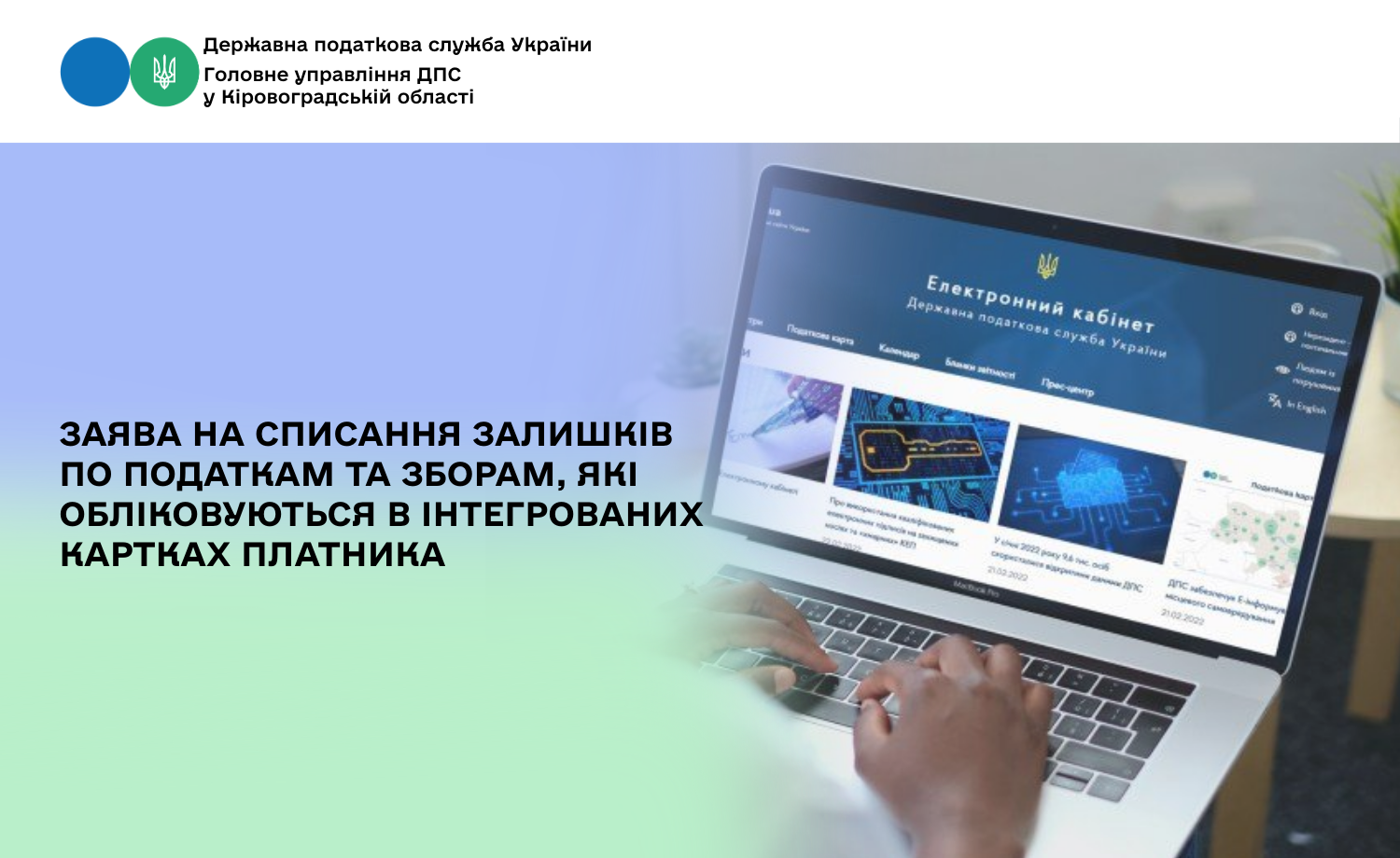 В приватній частині ІКС «Електронний кабінет» доступна для використання заява на списання залишків по податкам та зборам, які обліковуються в інтегрованих картках платника (електронний документ «Заява про списання помилково та/або надміру сплачених грошових зобов'язань до бюджетів та єдиного внеску до фондів загальнообов'язкового державного соціального та пенсійного страхування та/або відомостей з ЄДР щодо платників, за якими розпочата спрощена процедура припинення» (коди електронних форм F/J 1307601).