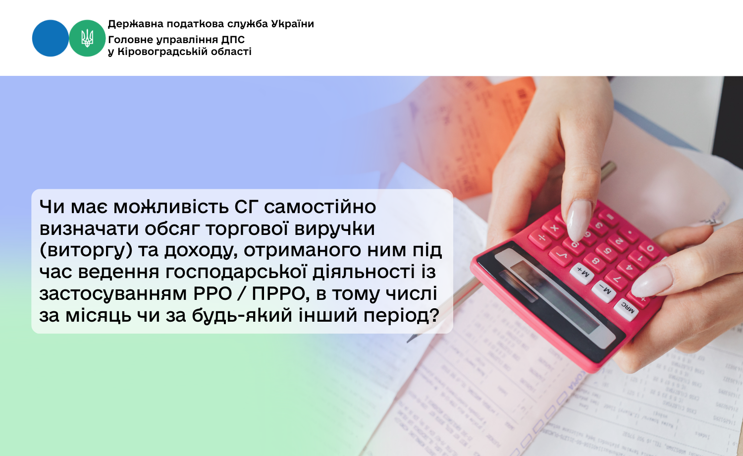 Враховуючи вищезазначене, кожен суб’єкт господарювання має можливість самостійно визначати обсяг торгової виручки (виторгу) та доходу, отриманого ним під час ведення господарської діяльності із застосуванням РРО / ПРРО, в тому числі за місяць чи інший необхідний йому період.