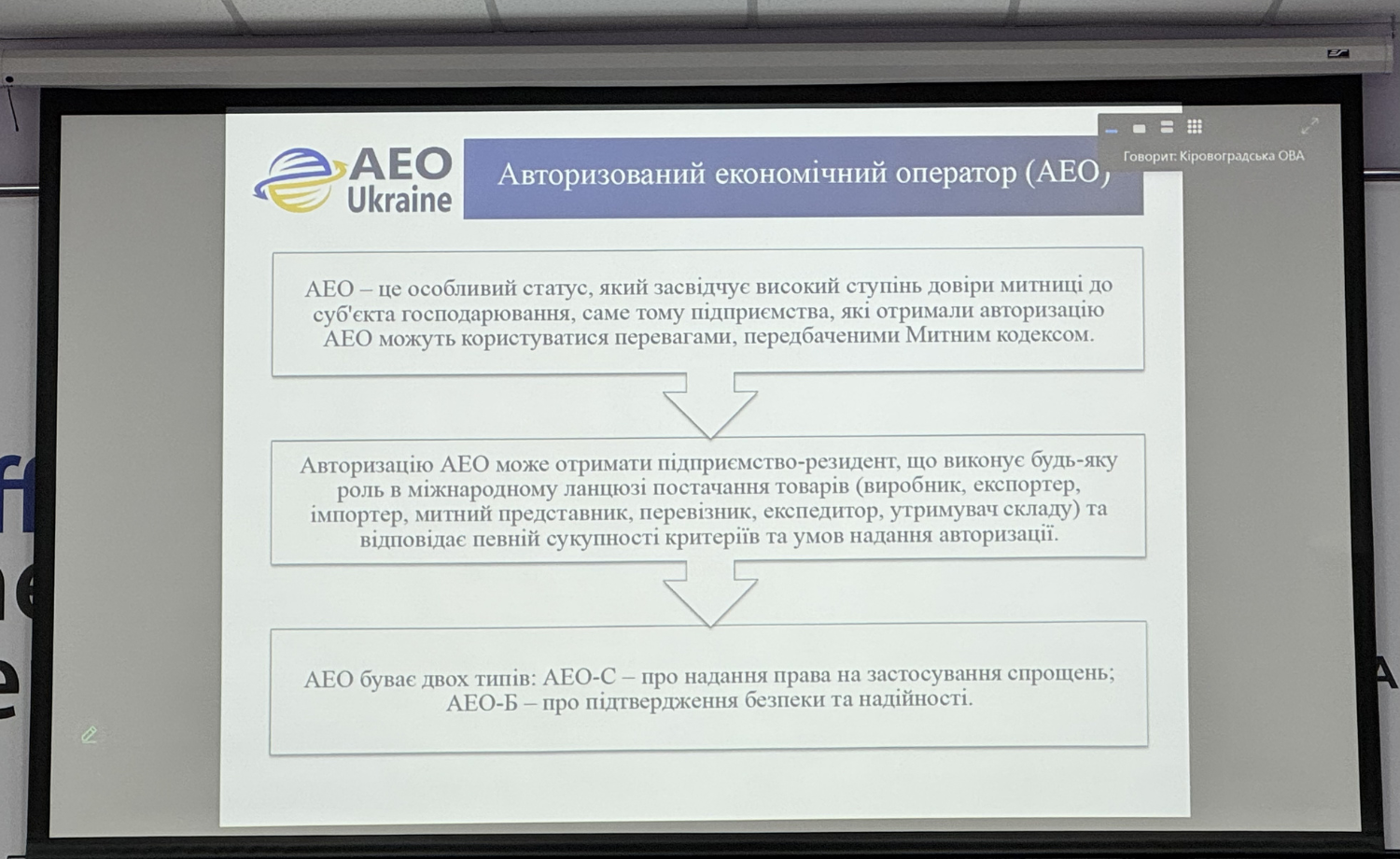 Сьогодні, 13 лютого 2026 року, у Кіровоградській обласній військовій адміністрації у межах платформи відкритої комунікації «Діалог влади та бізнесу» відбулася чергова онлайн-зустріч, присвячена актуальній темі – особливостям отримання підприємствами статусу авторизованого економічного оператора (АЕО) та авторизацій на застосування митних спрощень.