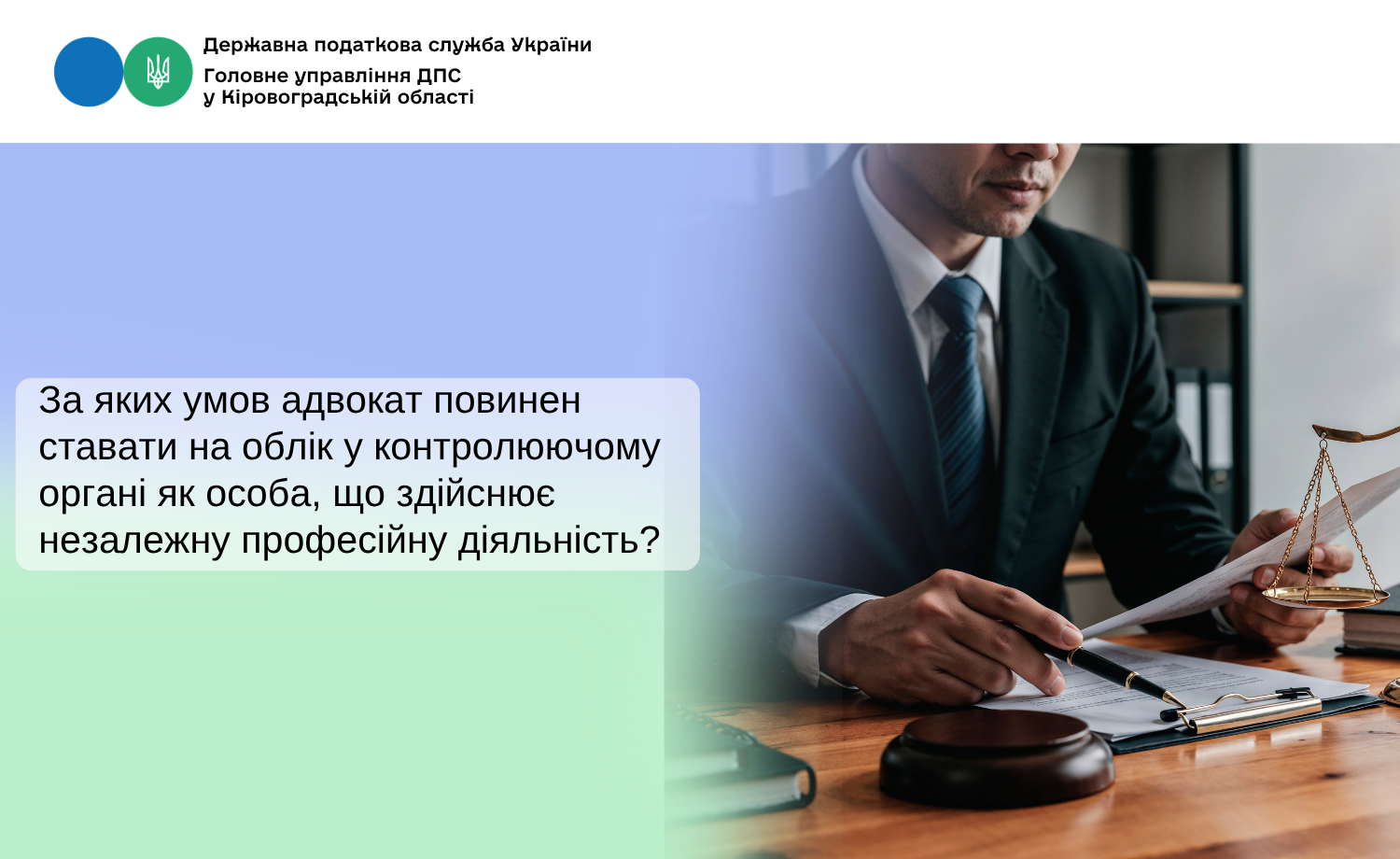 Отже, обов’язок адвоката стати на облік у контролюючому органі як особи, яка провадить незалежну професійну діяльність виникає за умови, якщо адвокатська діяльність здійснюється індивідуально, та така діяльність не припинена (зупинена).