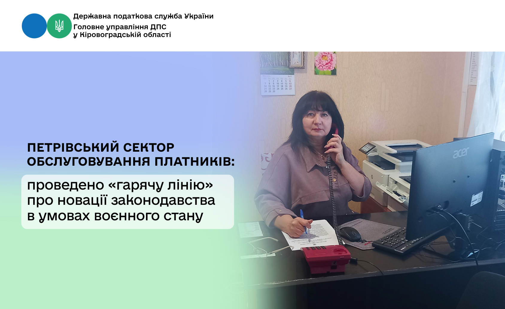 Петрівським сектором обслуговування платників Олександрійської ДПІ Головного управління ДПС у Кіровоградській області 9 жовтня проведено сеанс телефонного зв’язку «гаряча лінія», під час якої відповідала на актуальні питання платників податків про новації податкового законодавства в умовах воєнного стану завідувач сектору Наталія Пікінер.
